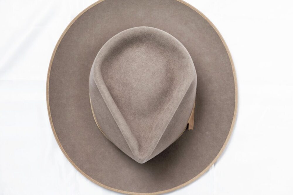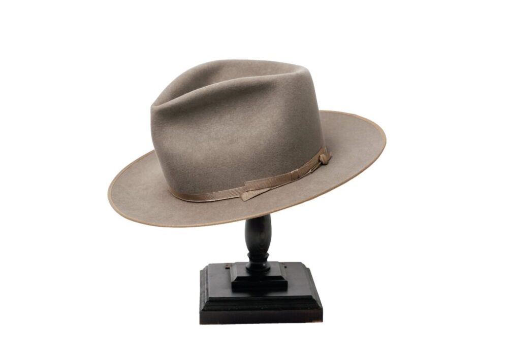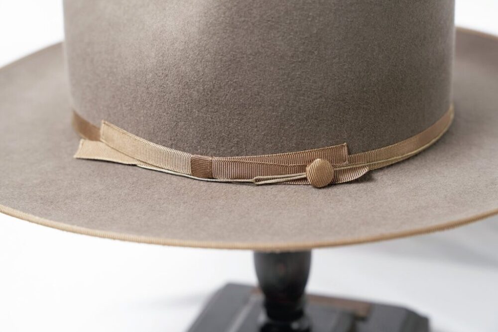 ドレス系とウエスタン系の見分け方としてもっともわかりやすいのがリボンの幅。10ミリ幅のダブルリボン仕立ての新作シグネチャーモデルは、1950年のウエスタンスタイルをオマージュ。特注したポルトガル産ラビットファーを用いており、流れるようなティアドロップクラウンは、職人のハンドシェイプだからこそ体現できている。端にはバウンドエッジを配している。7万5900円
