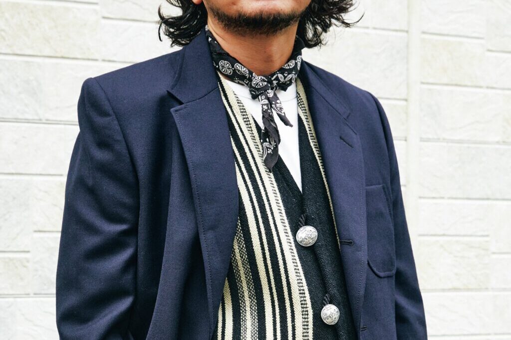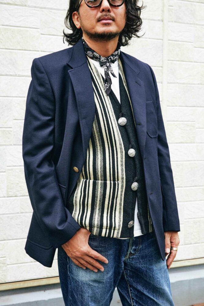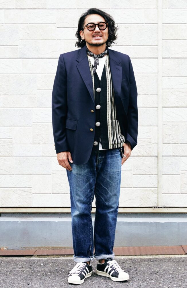 その当時をイメージし、自分自身もネイティブ柄ベスト、ジーンズ、スニーカーというアメカジの王道スタイルに合わせます。紺ブレの王道の合わせ方としては、やはりシャツを着てタイドアップ、パンツもスラックスなどが定番だと思いますが、紺ブレというものに力まずにカジュアルに落とし込み、あの頃の渋谷の街に溶け込むようなスタイリングを目指しました。渋カジらしさを等身大で楽しみながら、当時の面影を感じさせつつも、現代にも馴染むような装いがいまの気分です」
