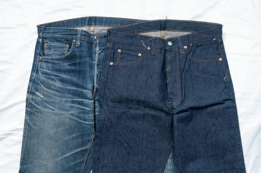 右は66モデルのデッドストック。見比べるとその素晴らしい経年変化がわかる。66の中でも濃いデニム生地を厳選したのもポイント。