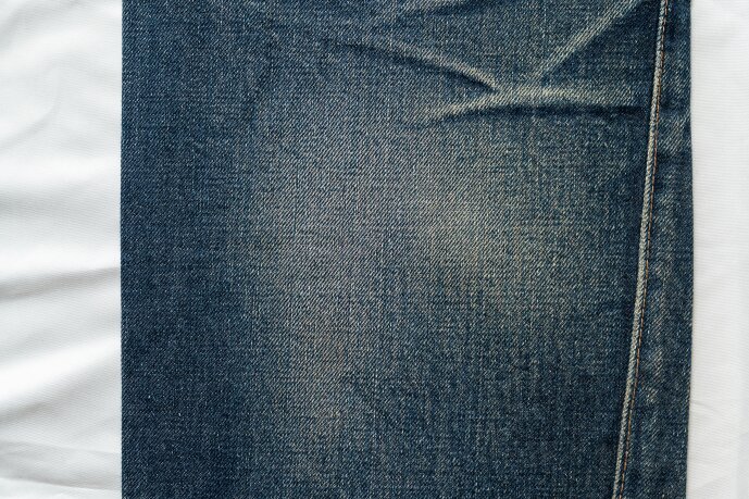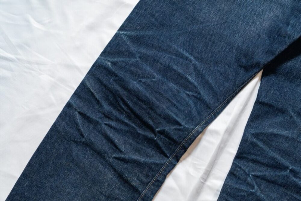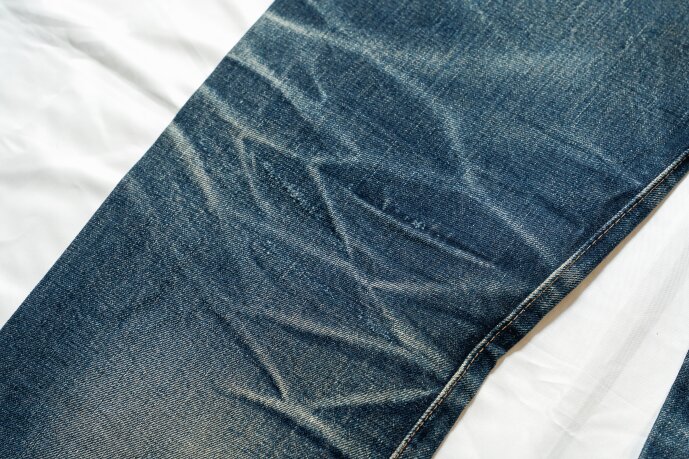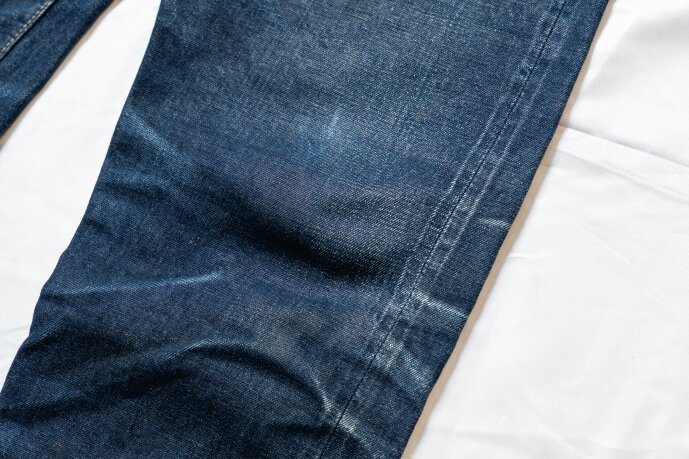 「理想とする腿のヒゲや膝裏のハチノスは、身体にジャストフィットしないと出ません。しかしリーバイスのように洗うことで10%近く縮んでしまうデニムは、未洗いのままだとサイズがゆるくて、逆に1度洗えば固さがなくなり、アタリが出にくい。そこで提案したのが、洗って縮ませ、そこから再度糊付けをすることで、デッドストックのような状態を作ること。そこから“儀式”と称したアタリを付ける作業をすることで、理想のエイジングの下地ができるのです」
