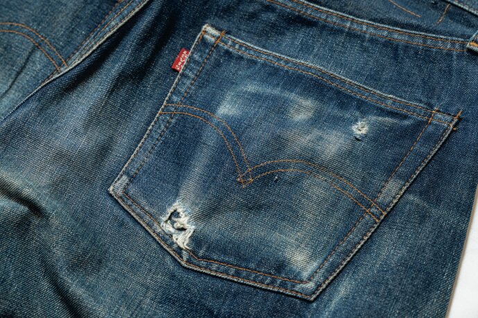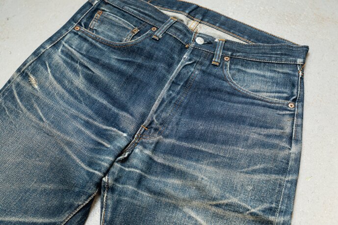 40歳の記念に購入したリーバイス501の66モデル。デッドストックから穿き込んでおり、この“糊付け”を実践したエイジングサンプル。まるで501XXのような濃淡が出ている。