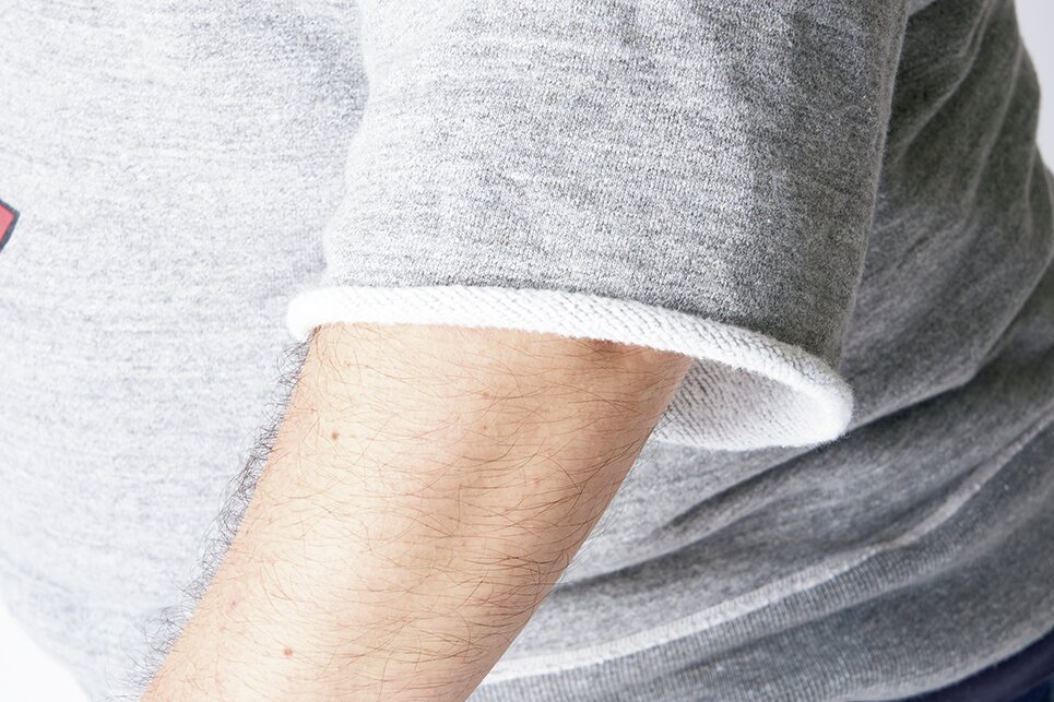 身長164㎝のぽっちゃり体型だから、XXLとか大きいサイズの服を買っても、ほとんどは袖が長いんだよね。スウェットの場合は、袖をたくし上げても肘の周りにたるみができて煩わしいからカットしちゃう。涼しいし動きやすいよ。ぽっちゃりは常に袖との戦いだからね。長さは、肘が隠れるくらいの七分丈にするかな。確か、映画『大脱走』のスティーブ・マックイーンも、スウェットの袖をカットして着てたよ。