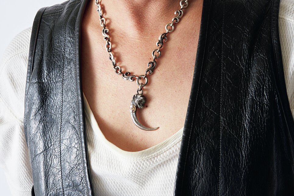 レザーラバーとして日々愛用しているUネックシャツ。大きく開いた胸元には、ファーストアローズのイーグルクローがよく映えるんだよ。担当していたブランドのアイテムだし、敬愛する長渕剛さんとの想い出も詰まっている。幸運を呼ぶお守りみたいな存在で、ないと不安になっちゃう。思い入れの強い大切なアクセサリーと、その輝きを最大限に引き出してくれるUネック。どんな時も欠かせない組み合わせだね。