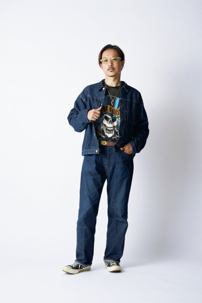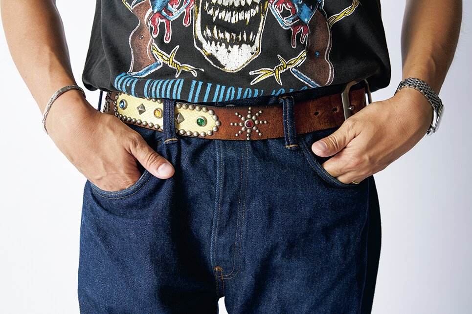 ベルトは、バックルの位置を正面じゃなくて横にずらして留めてる。20年以上続くこだわりの巻き方だね。ゴツいバックルが正面にあるとトップスのお腹部分が変に飛び出るから気になっちゃう。横にずらして留めれば、ベルトの柄や装飾が正面からしっかりと見えるようになるからイイなと思って。古着店で働いてた頃にベルトを作ったこともあったな。自分のデザインをHTCに別注してヴィンテージベルトを使って作ってもらったんだよ。