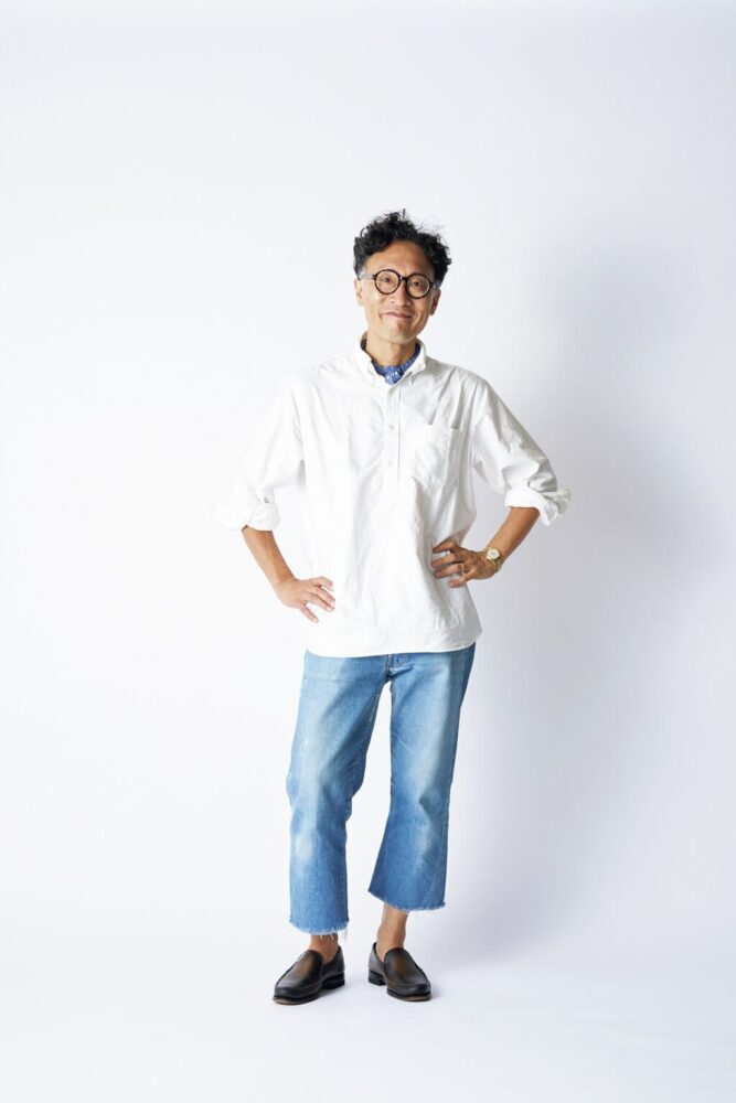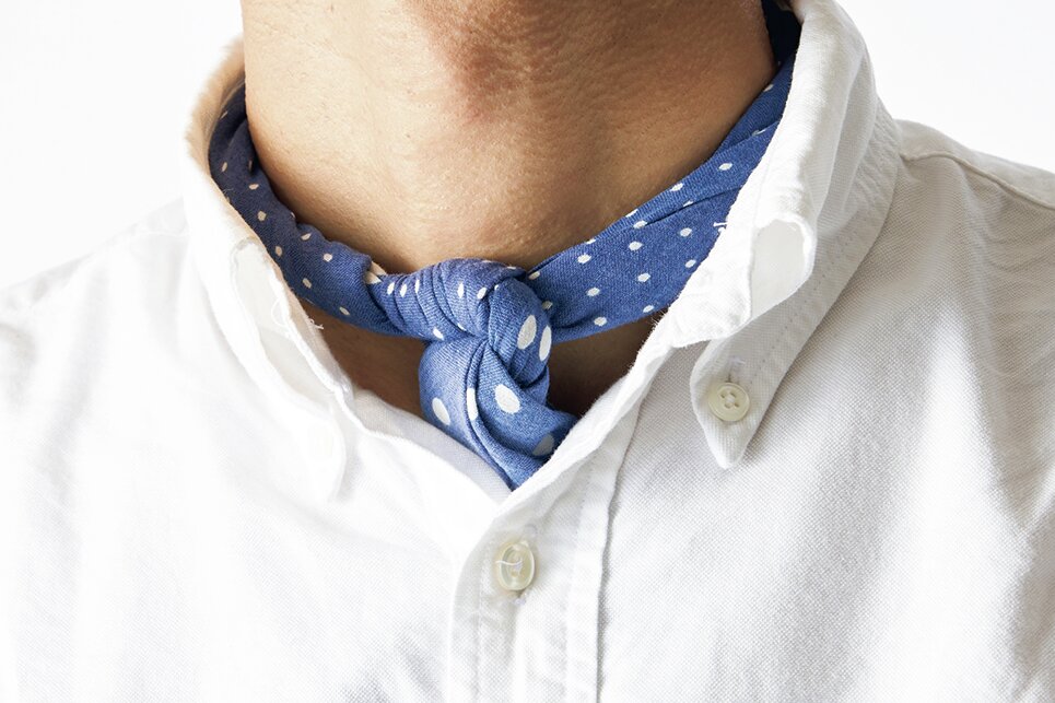 シンプルなスタイルには必ずアクセントを効かせてる。小さいテクニックでも全体の印象を変える大きな力があると思ってて。例えば、首元に巻くバンダナ。汗止めや襟汚れ防止としての実用性はもちろん、全体を引き締める大きな効果がある。シャツの捲り方も含めて、始めたきっかけは15年前くらい。兄弟誌の2ndでスタイリストたちと仕事をするなかで「シンプルな装いをいかにカッコ良く見せるか」を次第に意識するようになった。