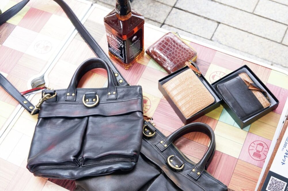 会場には池田工芸と共同開発した赤茶芯のヘルメットバッグや L字ファスナー財布など、茶芯レザーコレクションをフルラインナップで展示。来場者はジャックダニエルを片手にエイジングサンプルを手に取っていた。
