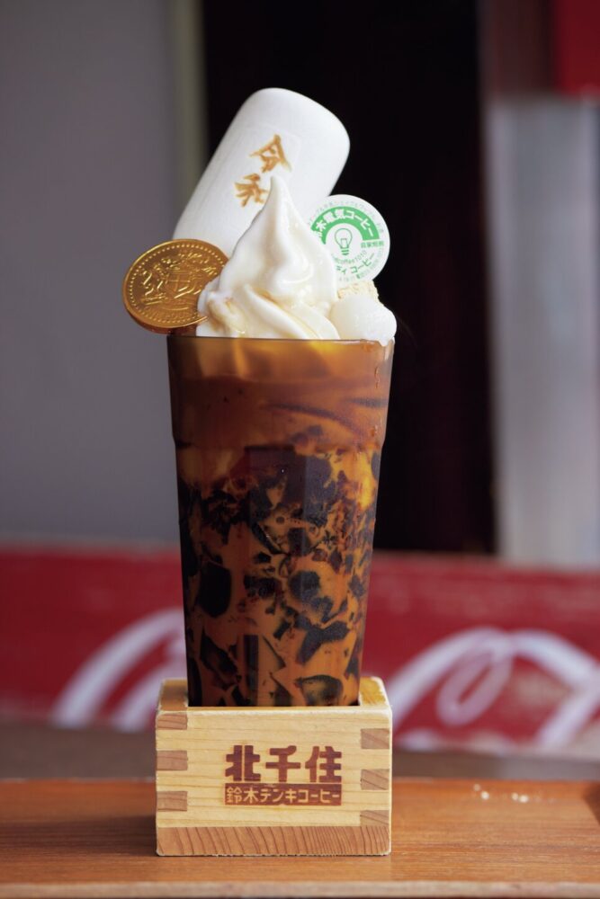 エスプレッソをかけた牛乳シェイクのうえに、黒蜜×きなこ×白玉団子×特製モナカをトッピング。大人の苦みが全体をバランスさせるたっぷりの珈琲ゼリーがたまりません。1400円