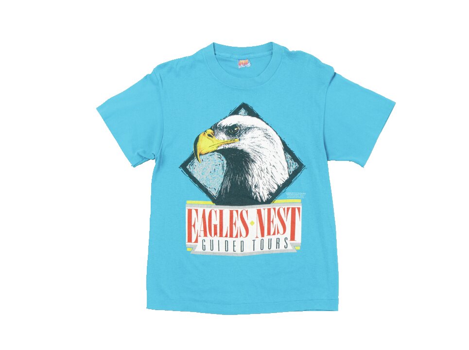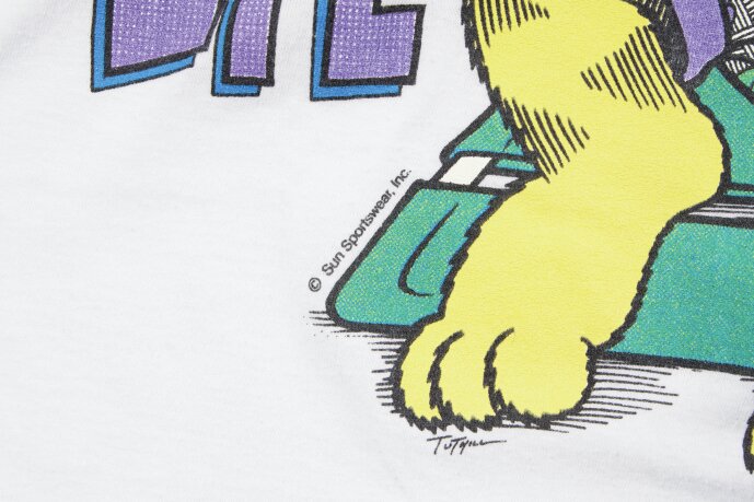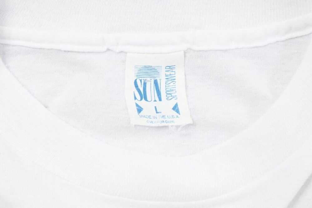 ボディいっぱいに大きく入る大胆な絵柄とカラフルな色使いを得意とする「Sun Sportswear」。80s後期から90sに「ルーニー・テューンズ」や「ガーフィールド」などのキャラクターTシャツも製作していたブランドである。同年代のTシャツが並ぶ中でも、ここのデザインはポップさが際立ち目に付きやすい。