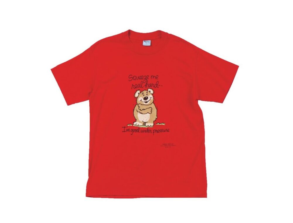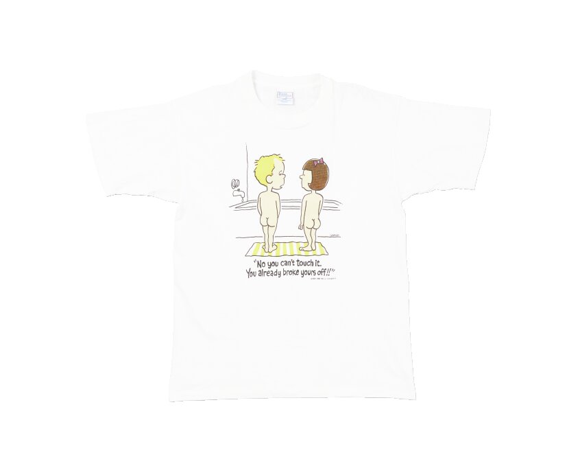 かなりシュールなデザインが多い「PUT ME ON」。絵柄を見て「どういうこと?」と疑問に思い、文字を読んでクスッとさせる引き込まれるデザインが特徴である。襟下にオリジナルのタグは付かず、絵柄の下などに小さく入るコピーライトで確認が可能。その末尾に年号が入り、多くは90s初期のものである。数年しか製作されていない可能性があると考えると、より欲しくなる存在だ。