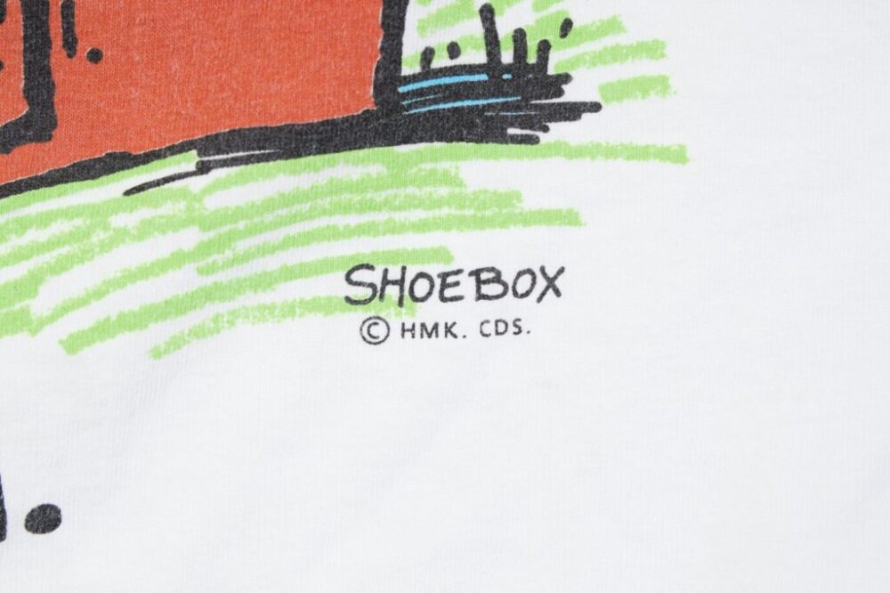大体が白ボディだが、先に紹介したもののように赤ボディが使われるのは「SHOEBOX」の中でもかなり珍しい。襟下にオリジナルのネームタグは付かないため、判断する際はプリント下などに入るコピーライト表記で確認が必要だ。また、デザインが非常に似ている「CAROUSEL CREATIONS」というブランドのTシャツも存在するので、もし見つけたら比べてみるのも面白い。