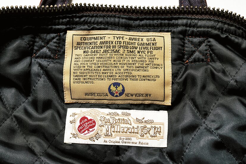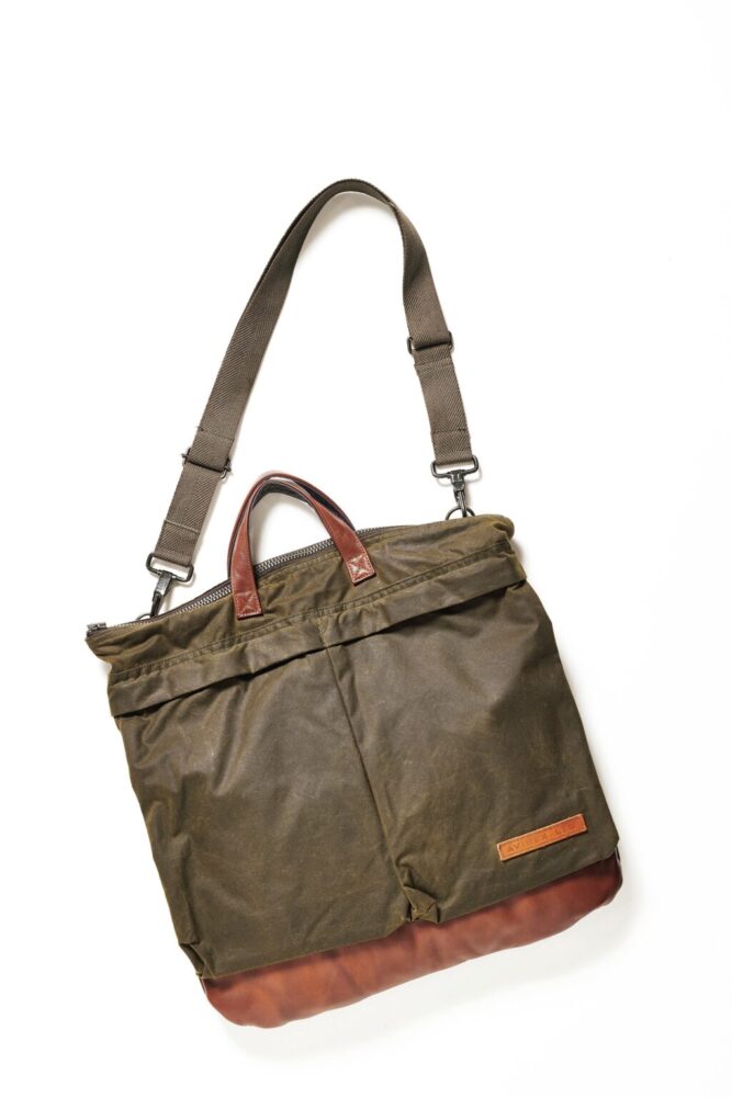 英国ミラーレーン社の撥水ワックスを染み込ませたオイルドコットンを使用したヘルメットバッグ。着脱可能なショルダーストラップが付属し、機能性も十分。ハンドルと底部にはレザーを使用しており、エイジングも楽しめる。背面にはAVIREXらしいミリタリー調のステンシルが施され、デザインのアクセントにも一役買っている。5万9400円(AVIREX新宿 TEL03-5367-2013 http://www.avirex-usa.com)