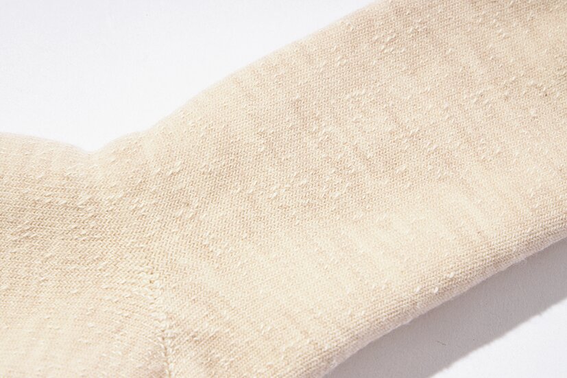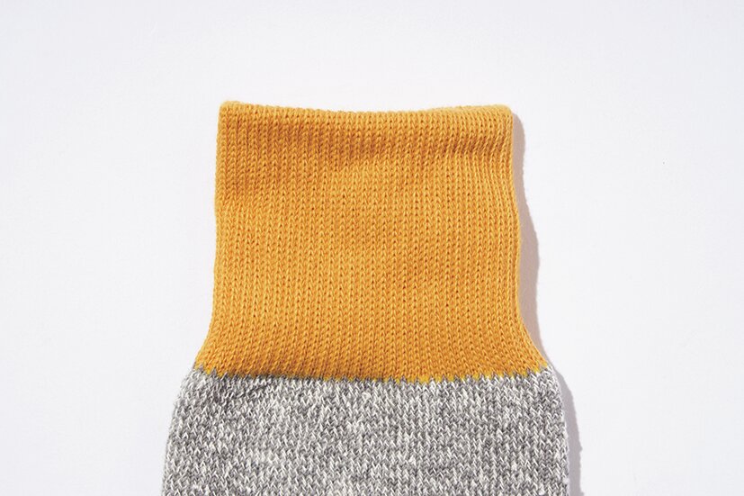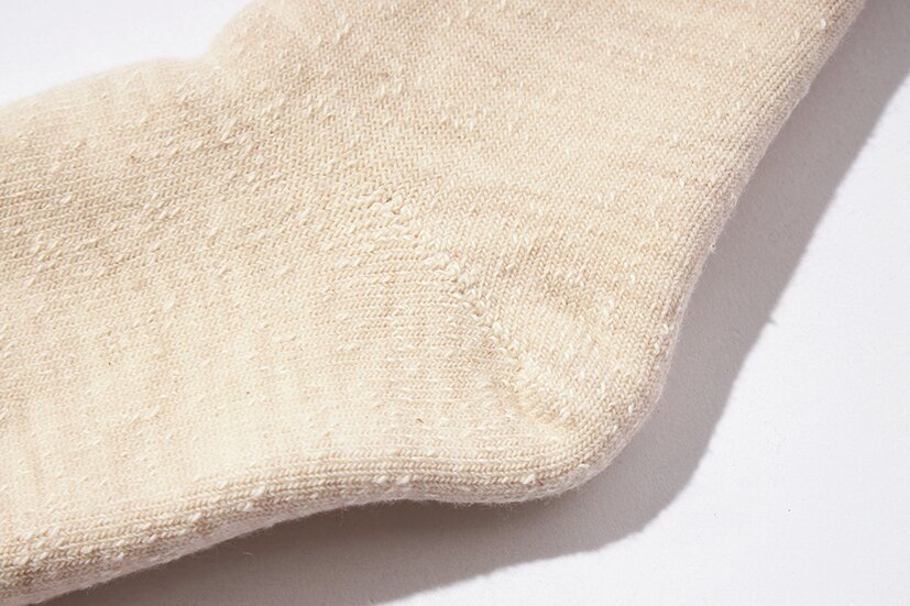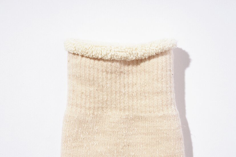 定番のダブルフェイスクルーソックスは、登山用ソックスから着想を得たもので、スウェットのような肉厚な生地が魅力。