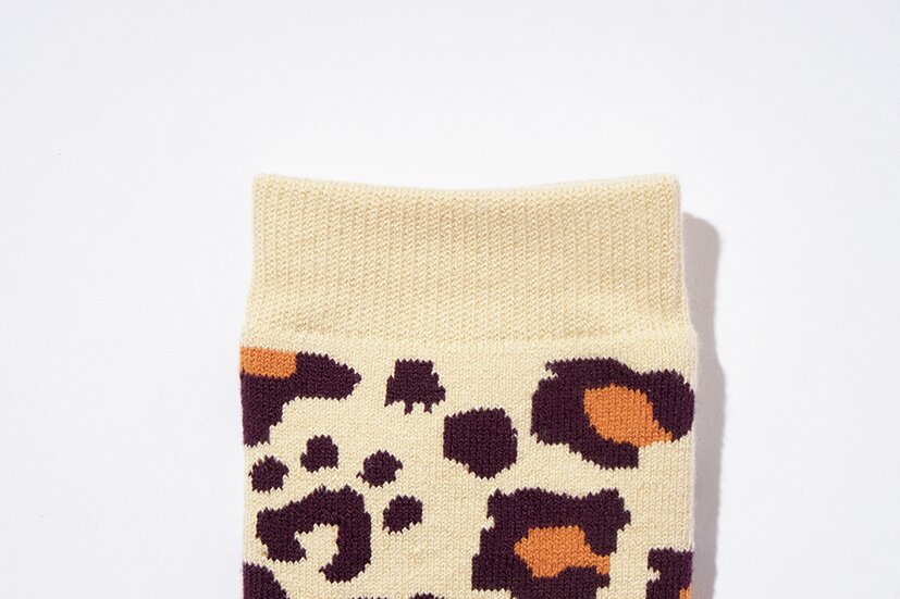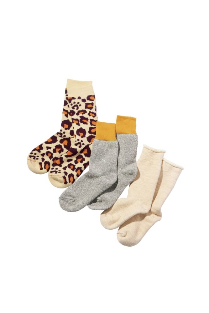 奈良県にある国内随一の靴下生産地で作られているROTOTO。その履き心地は折り紙付きだ。購入したのは定番のダブルフェイスクルーソックス(右)2750円、ダブルフェイスクルーソックス“シルク&コットン”(中)2310円、パイルレオパードクルーソックス(左)2530円。(ROTOTO https://www.rototo.jp)