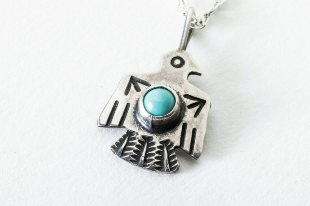 ナバホ族がハンドメイドで作ったスターリングシルバー製のペンダントヘッドで、モチーフとしては定番のサンダーバードですが、キュートな顔と、思わず「ちゃん付け」したくなるほどの小ささに惹かれて購入。