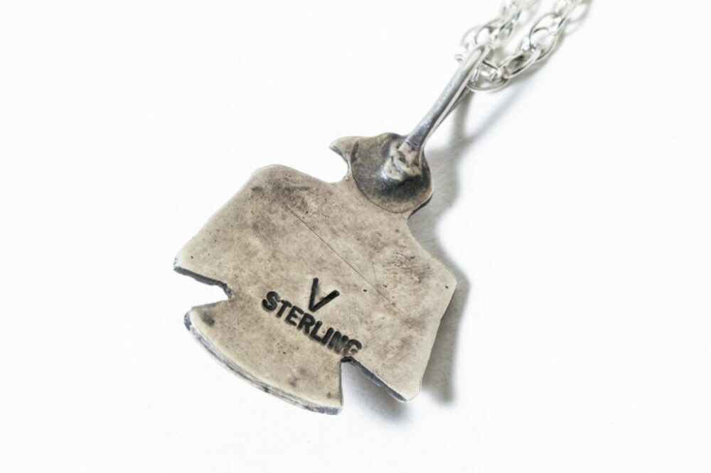 ペンダントヘッドの裏面にはシルバー925を意味する「STERLING」を表記。Vの刻印は作者であるアーティストのイニシャルかと推察されます。