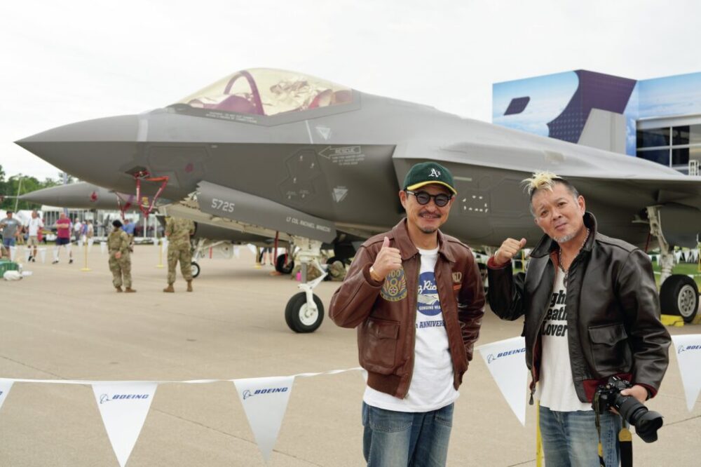 F-35ライトニングⅡを前に記念撮影。このエアショーでは、最新鋭機の展示も行っている。ちなみにケリー・ジョンソンが設計した初代となるP-38ライトニングの展示も行われており、大人気だった。
