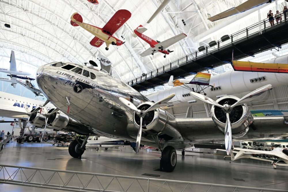 銀色のボディが美しいパンアメリカン航空のボーイング307ストラトライナー。世界初の与圧式キャビンを持つ商業用旅客機だ。
