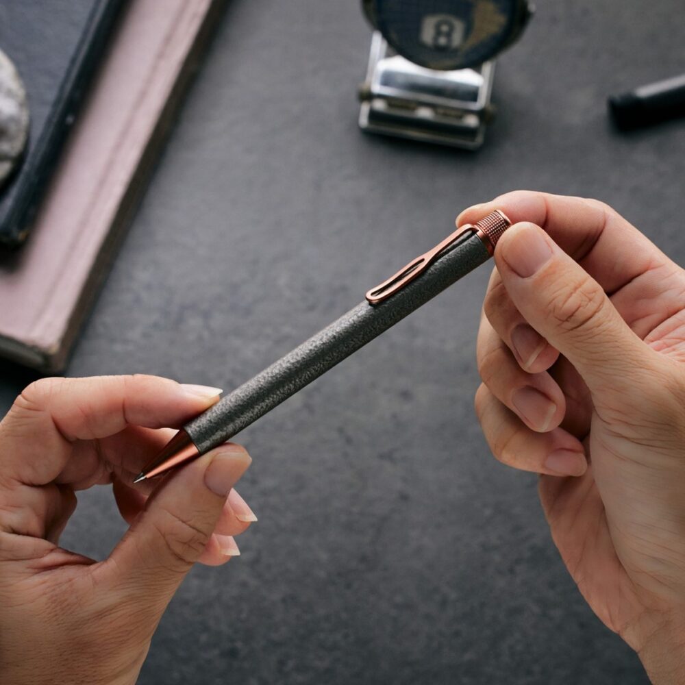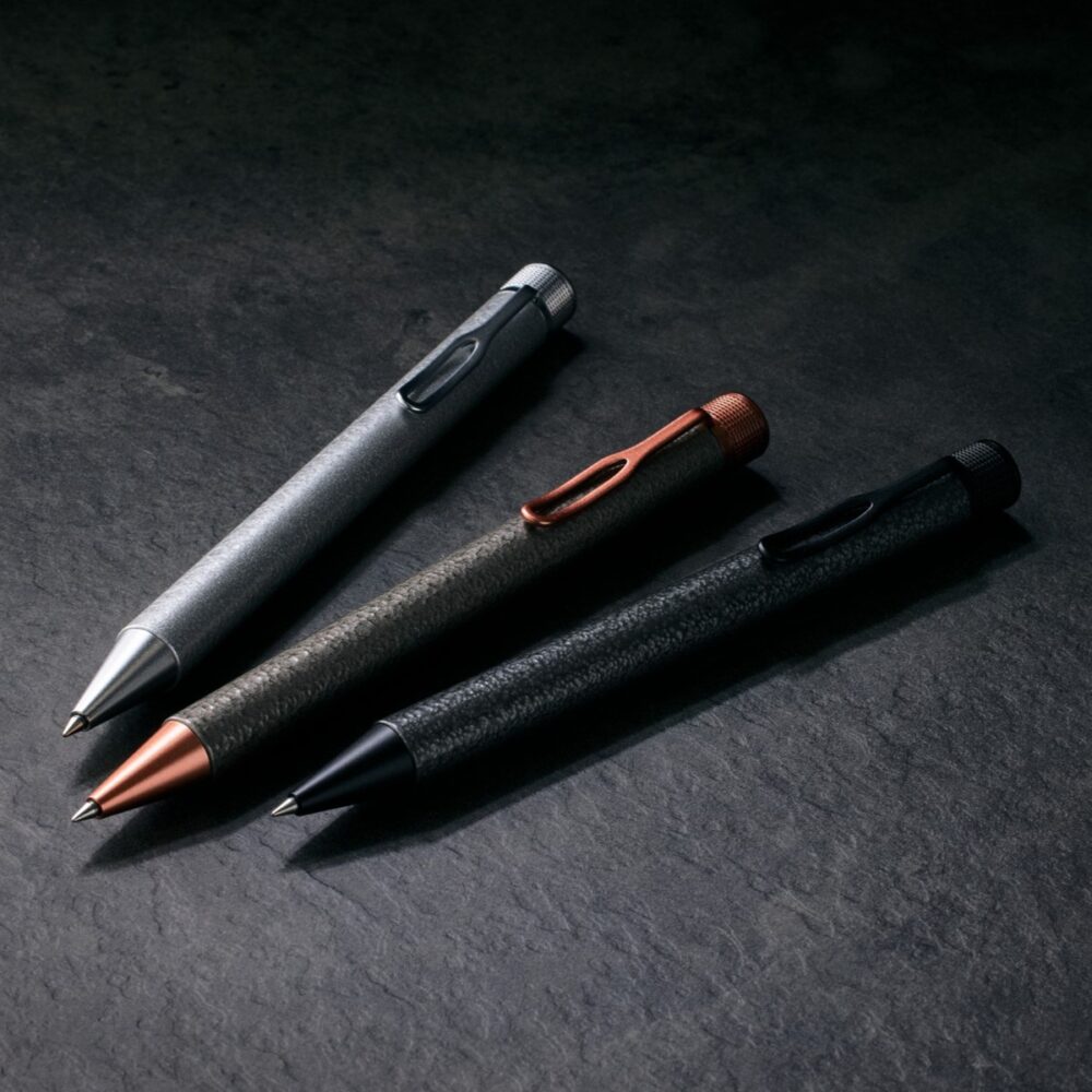 「SAKURA craft_lab 010」は、“不均衡の美学。”をコンセプトとした、ハンマートーン塗装による凸凹感のある表情豊かなボディが特長のボールペン。ハンマートーン塗装の不均一で無骨な質感を引き立てるため、ハンマートーンシルバー、グレー、チャコールの3種類のボディカラーをラインアップした。頭冠には、丁寧に削り出されたサクラのマークと、その周囲に広がる波紋の模様、さらにカメラのダイヤルを思わせるローレット加工を施し、細部までこだわり抜いた一本に仕上げている。