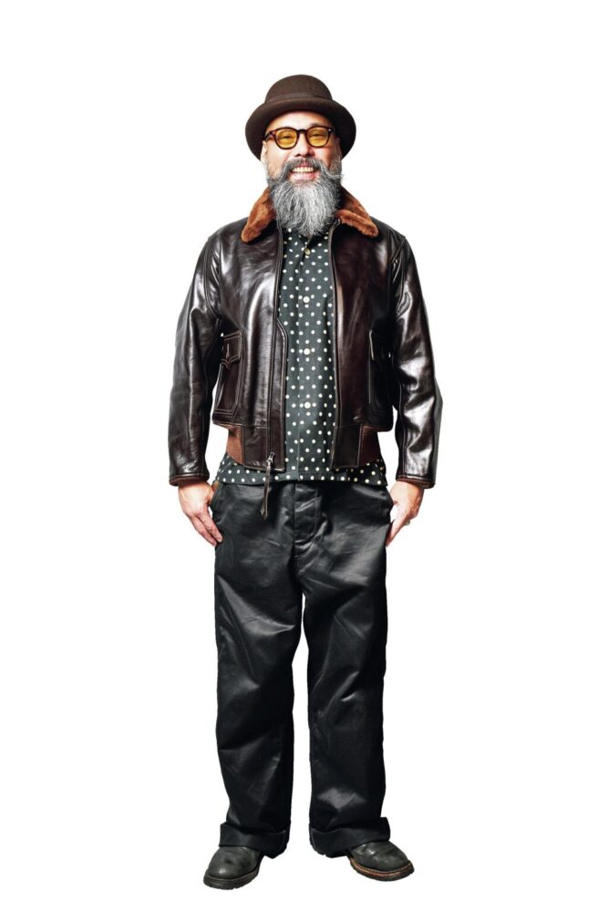 機能服の代名詞・フライトジャケットを50sらしいデザイン性のある華やかなスタイルに落とし込んだ、“ファッション的ミリタリースタイル”の好例。コーディネイトを黒と茶の2色で構成することで全体としての統一感が生まれている。