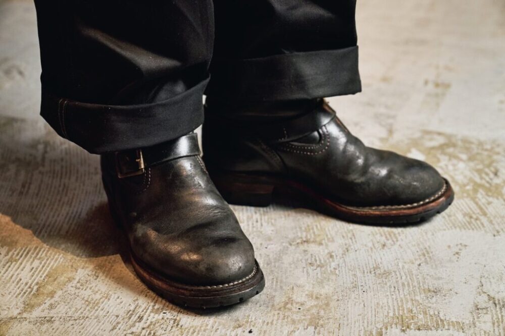 足元にはアメカジの定番・エンジニアブーツをチョイス。ハット、シャツ、パンツをクリーンなアイテムでまとめた分、足元には王道のアイテムを持ってくることで全体としてのバランスを取っている。