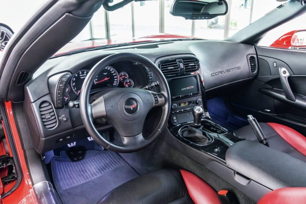ブラックに赤いアクセント&赤いステッチの入るシートはZ06の専用装備でヘッドレストにZ06の文字が入る。