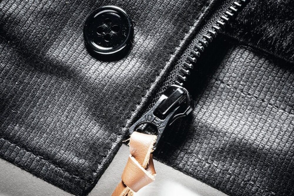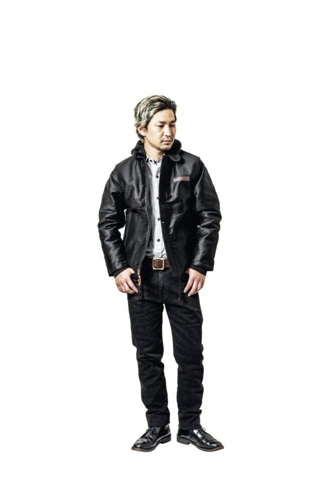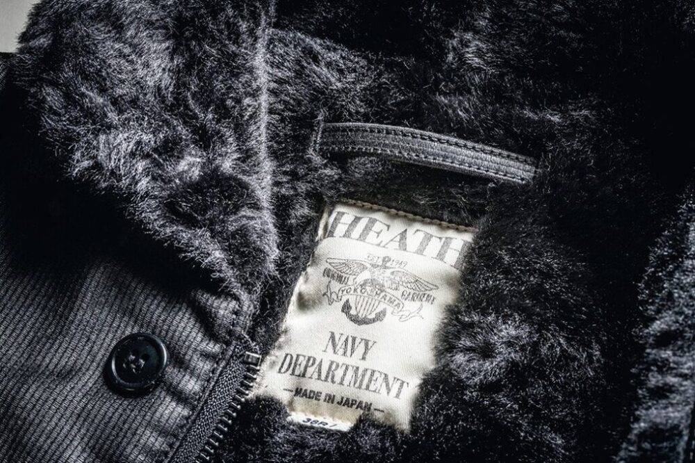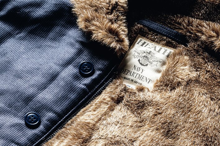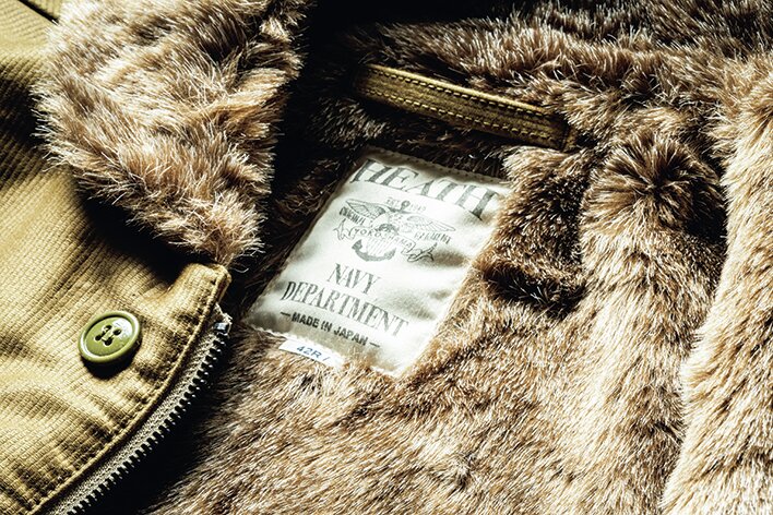 フロントはヴィンテージと同様にベル型のジッパーを使用。グローブ着用時でも開閉しやすいようにレザーの引き手も付く。さらにボタン留めの比翼も装備。その優れた防寒性が、極寒の中で戦艦の甲板で働く海兵たちを守ったのだ。