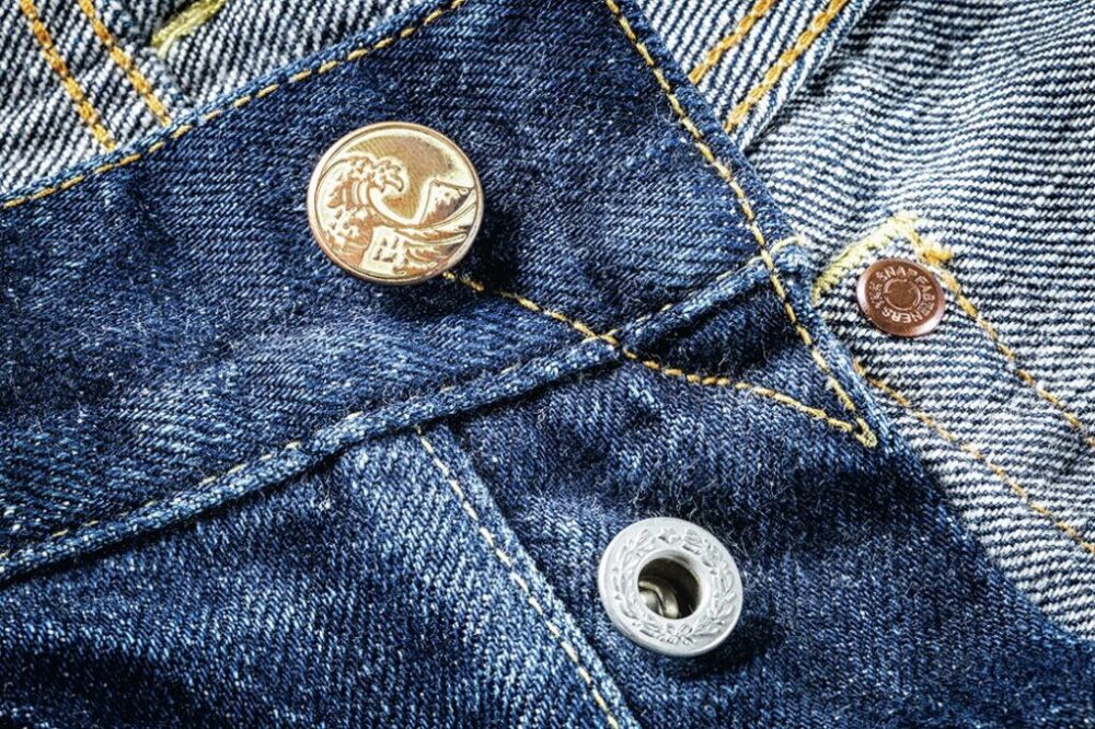 革パッチと同様に浮世絵のデザインを落とし込んだオリジナルのトップボタンも見逃せない。経年変化すると濃淡のメリハリが生まれ、立体感がさらに増していく。