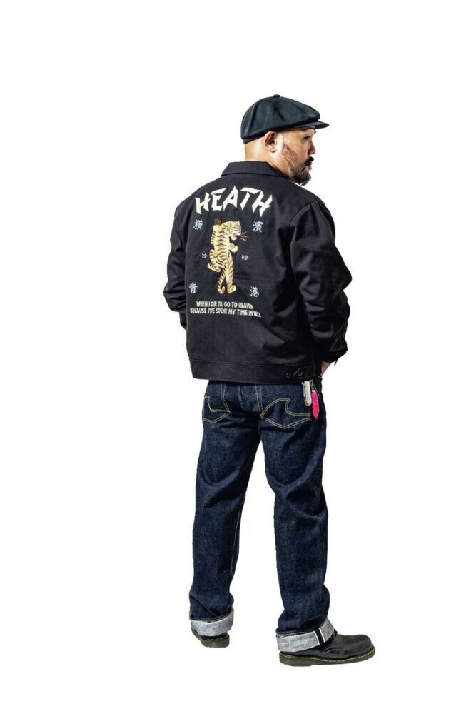 HEATHが手がけるデニムブランドが横濱デニム。聖地である児島産のセルビッチデニムを使ったモデルで、1950年前後のストレートシルエットが特徴のモデルだ。こちらは海老名店店長の渡邊さんが週4日で約2年間着用したもの。