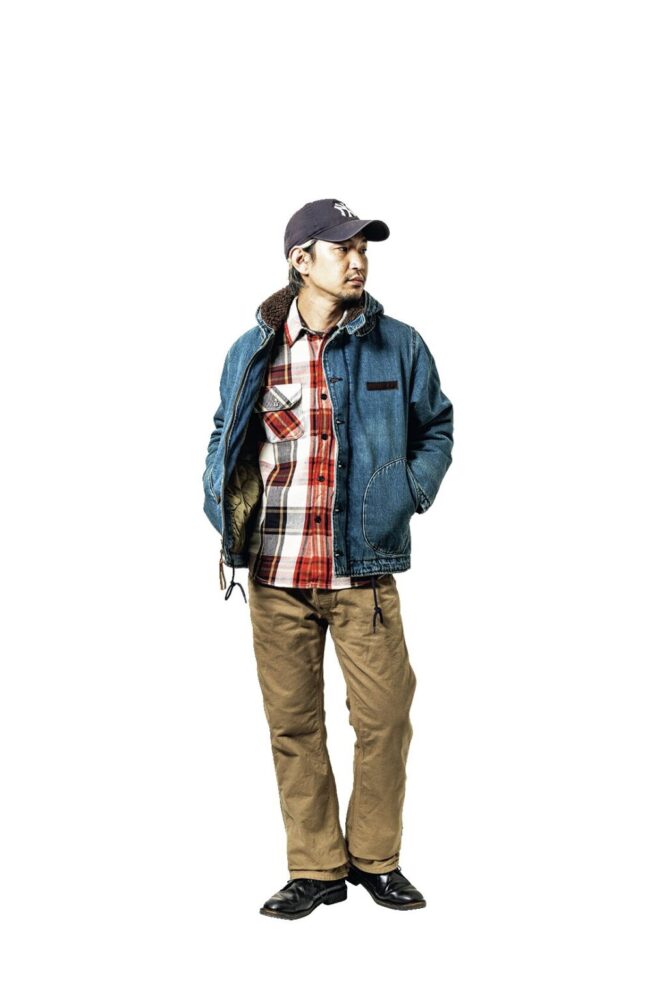 やはりN-1の定番スタイルといえばアメカジ。インディゴジーンズとの相性は抜群で、インナーに合わせたネルシャツの裾をチラ見せすると良いアクセントに。もちろんスウェットを合わせてもカッコイイぞ!