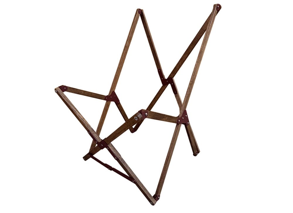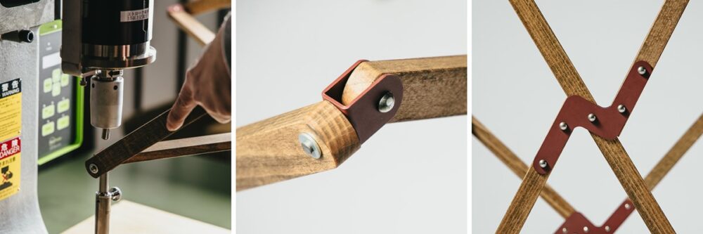 リベットはネジとは違い特殊な機械を使って固定する(カシメる)ため、カシメる為の機械もメーカーに特注で製作してもらった。リベットでパーツを連結・固定することにより、パーツが外れることもなく安全性も担保され、細い木材フレームながら耐荷重100kgを実現することができている。