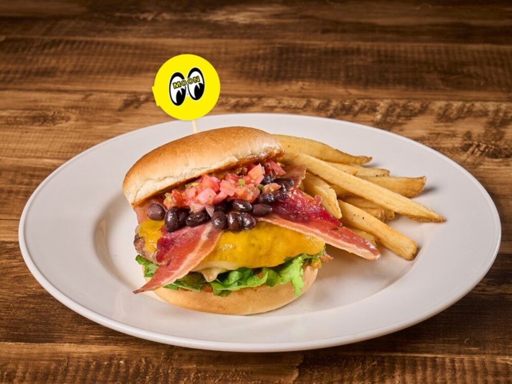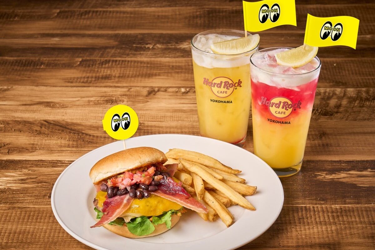 また、レストランでは、このコラボグッズ販売を記念したスペシャルメニューとして、MOONEYES®とハードロックカフェの世界感を感じられるハンバーガーとカクテル2種を提供。バーガーにおいては、アメリカ・カリフォルニア州サンタフェスプリングスにルーツを持つMOONEYES®から発想を得た、スパイシーなサウスウエスタンスタイルの「サンタフェバーガー」を提供、ドリンクでは、オレンジ、パイナップル、グレープフルーツにパッションフルーツとグレナデンを加えた爽やかなカクテル「トロピカルフルブースト」、オレンジ、パイナップル、クランベリー、レモネードにパッションフルーツを加えたトロピカルなノンアルコールカクテル「ゼロヨン サンライズ」の2種を用意。なお、当商品いずれかをご注文で、特製オリジナルステッカー(非売品、なくなり次第終了)をプレゼントする。