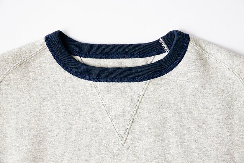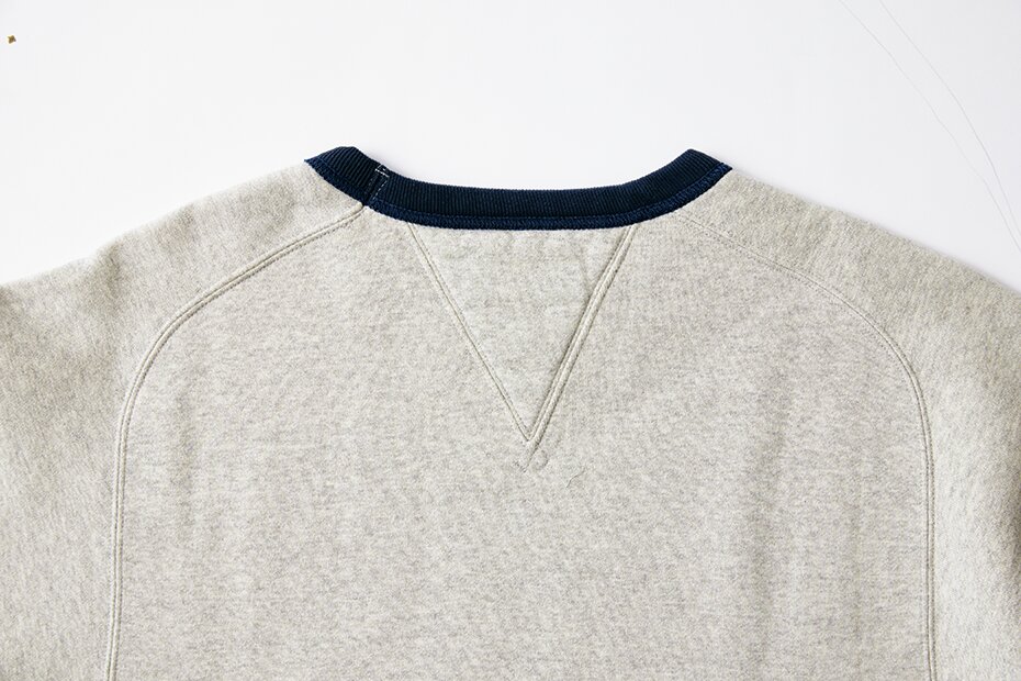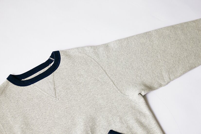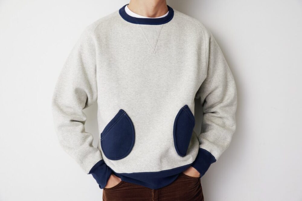 このボクシンググローブポケットが目を引くスウェットシャツは、Vガゼットの生地が前後で違っていたり、袖付けがフリーダムスリーブであったりと、細部にまでこだわりが詰まっています。そして個人的にいちばんのポイントは、バイカラーのデザイン。ベーシックなグレーのスウェットシャツに、首元、袖と裾のリブ、ポケットのネイビーが程よいアクセントに。先述したモノづくりへのこだわりも相まって、着ると背筋が伸びる気がします。もうスウェットがダル着だなんて、絶対に思いません。