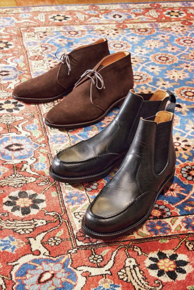 今シーズンは”バックトゥベーシック”をテーマにクラシックながらも、どこか一癖あるコレクションを展開。手前のGBSGサイドゴアは、独自のアプローチでモックトゥを製作。奥の7706チャッカブーツはチャールズFステッドのスーパーバック。右/106,700円、左/84,700円