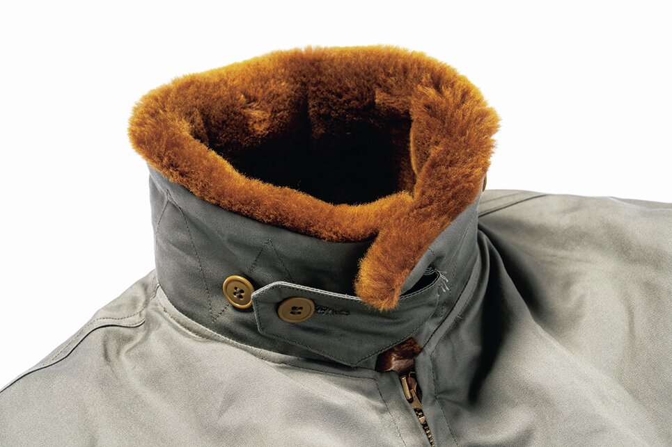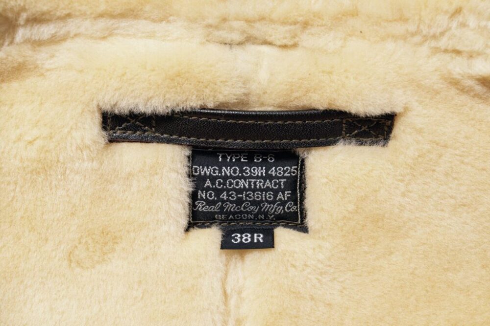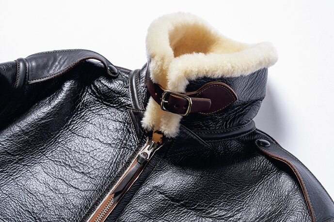 B-3よりも軽量で、高い運動性を誇るジャケットとして、1939年の春に開発されたのがB-6だ。夏季用のA-2と、極寒用のB-3の中間となる、インターミディエイトゾーン用として着用されていた。1939年から1943年までのわずか4年間で9回も発注されており、その最終型のディテールを取り入れている。アジャスタの役割を担う裾のレザーストラップもそのひとつ。ムートンの毛足の長さに限っては、当時の規定である1/4インチでなく、あえて長めの1/2インチで再現している。