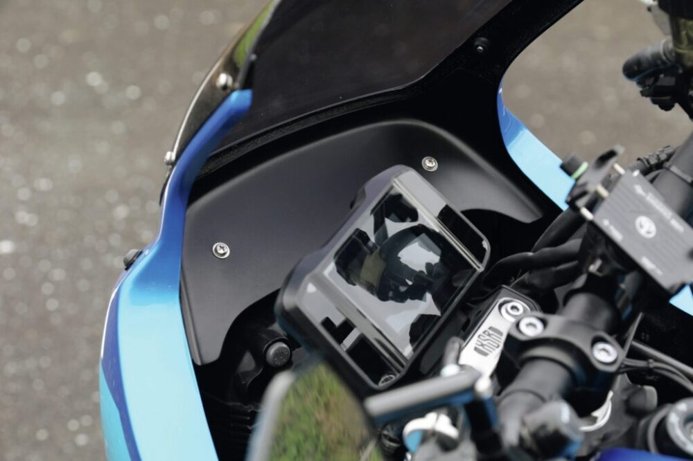 フロントアッパーカウルは、写真のようなグリップ位置が高いバーハンドルでも低い位置になるセパレートハンドルでも干渉しないような形状になっている。使い勝手の部分まで考えられているのだ。