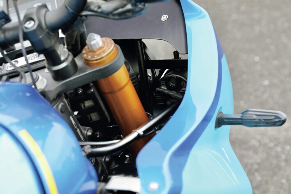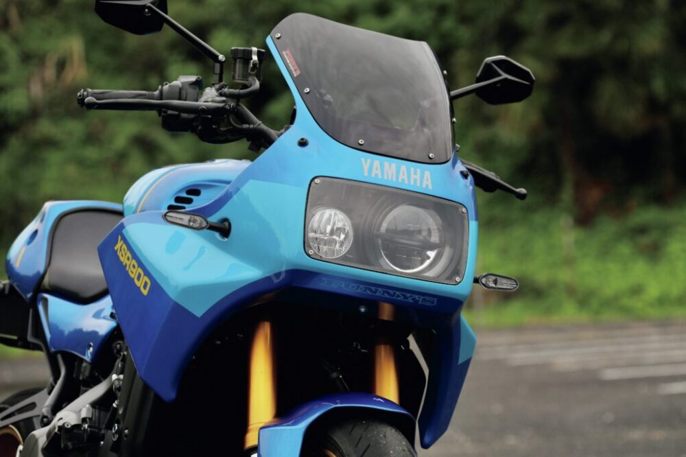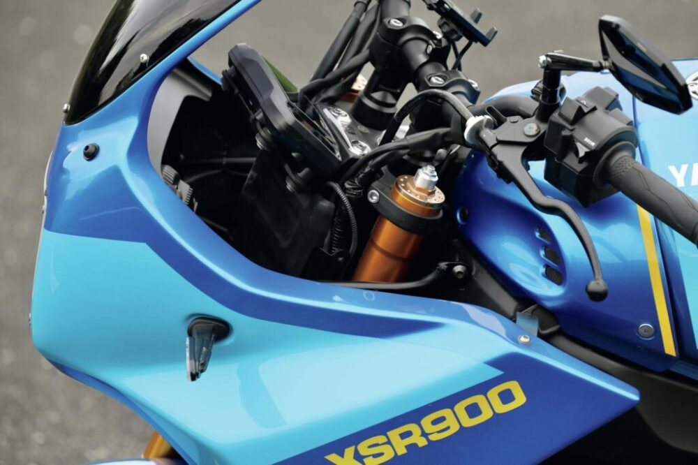 ベースとなっているXSR900はヘッドライト周りにカウルが付かないネイキッドモデル。そのため高速道路を走ると上体に走行風がもろに当たって、長時間走り続けるには根性がいる。そこで、その苦行から解放されるフロントアッパーカウルをどんな形状にしようかと考えていた時に、往年の名車FZ750風のカウルが欲しいという声があり制作したのだそう。とって付けた感がなく自然と車体に溶け込んでいるのがいい。