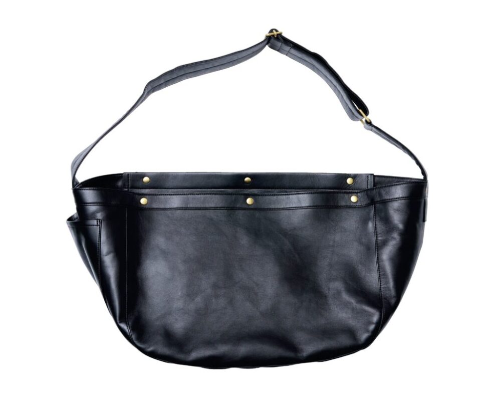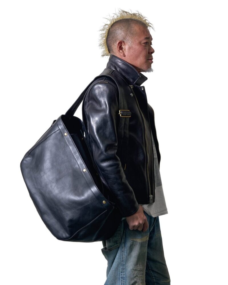 本来は大胆なグラフィックが特徴のニュースペーパーバッグを潔く茶芯ホースハイドで再構築。革ジャンを作るのと変わらないほどの量の馬革を贅沢に使用しており、モヒカン小川の言葉を借りると「言うならば背負える革ジャン」。普段使いはもちろんのこと、数泊の出張にも持っていけるほどの大容量を誇る。