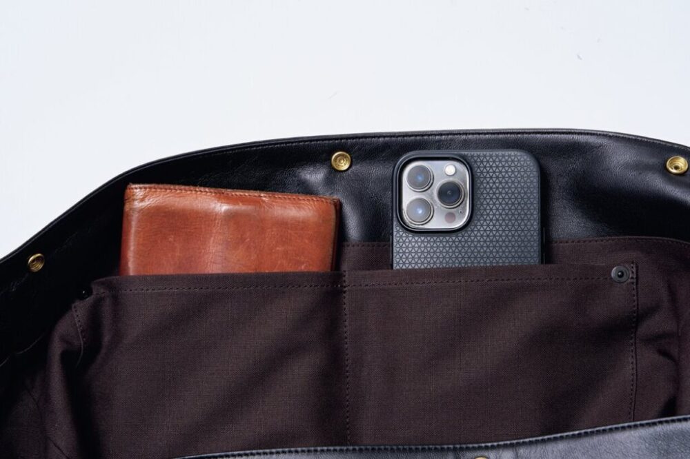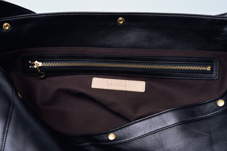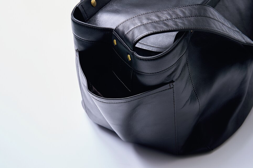 レザーは、欧米産の原皮を国内のタンナーで鞣し、1度芯通しでブラウンに染め上げてからブラックを乗せた正真正銘の茶芯の馬革を採用。茶芯の馬革に合わせてステッチはブラウン、金属パーツはレザーと同じく経年変化を楽しむことができる真鍮製、ほか内側と外側に計4つのポケットが付くなど細部のデザインにまで抜かりがない。