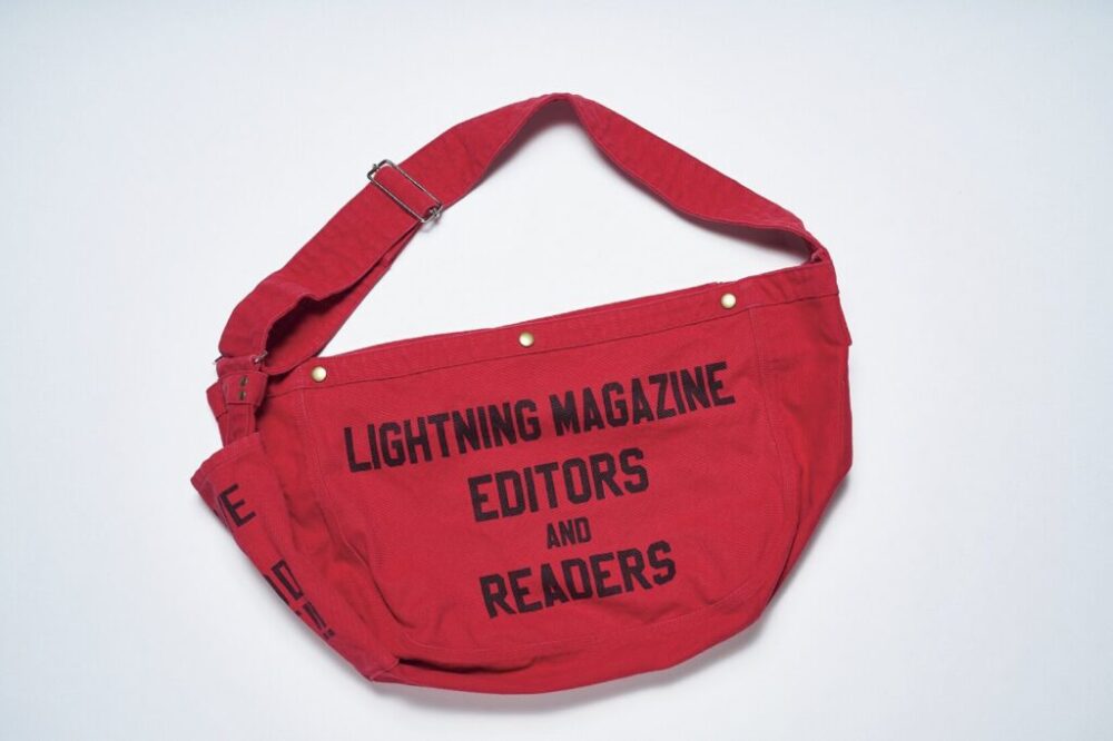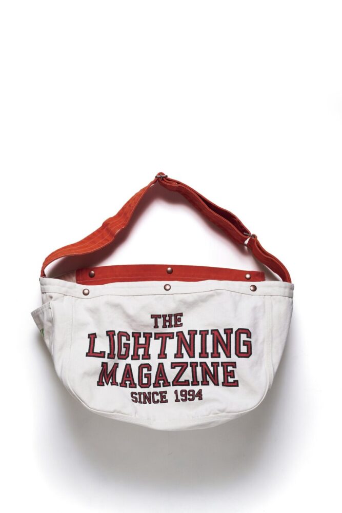 このニュースペーパーバッグのデザインソースはヴィンテージのニュースペーパーバッグを参考にライトニングが製作したこのバッグ。長さが調整できるベルト、取り外しが可能なカバーが付くなど、機能性も申し分なく、大人気のアイテムであった。ちなみにサイズは縦約35㎝、横約45㎝、マチ約28㎝と非常に大容量で、撮影物を運ぶ際の“衣装バッグ”として使うもの編集部員もいた。