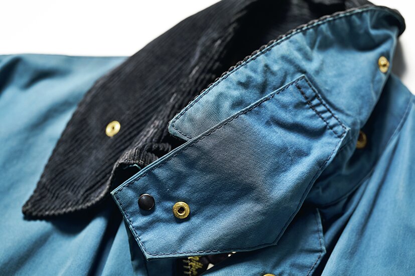 襟を立てても美しく実用的なのがバブアーの良いところ。青が映える。