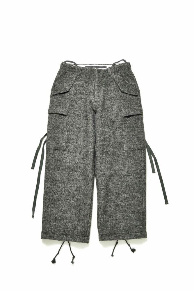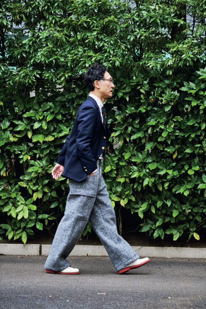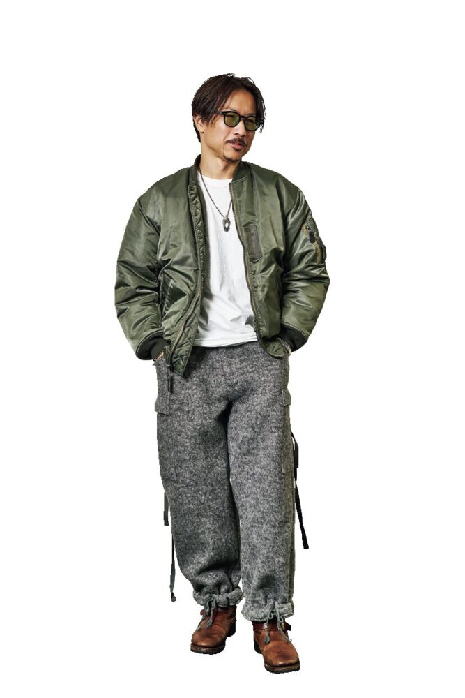 デザイナーさんには「これを軍パンにするなんて普通じゃない」って言われちゃったんだけど、めちゃくちゃエレガントじゃね? あえてブーツに引っ掛けずに穿けば、こんな俺でもマイルドな印象に……。サンプリングしたのは米軍のM︲65だから普段のコーディネイトと同じ感覚だし、この分厚さも男心をくすぐるんだよね。