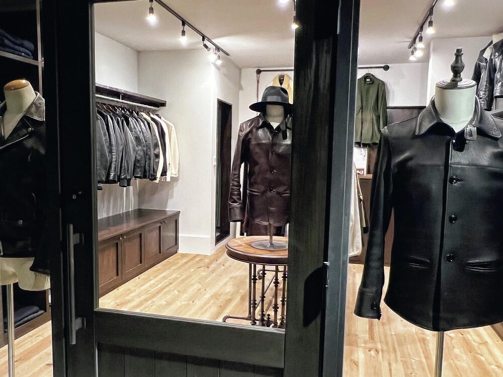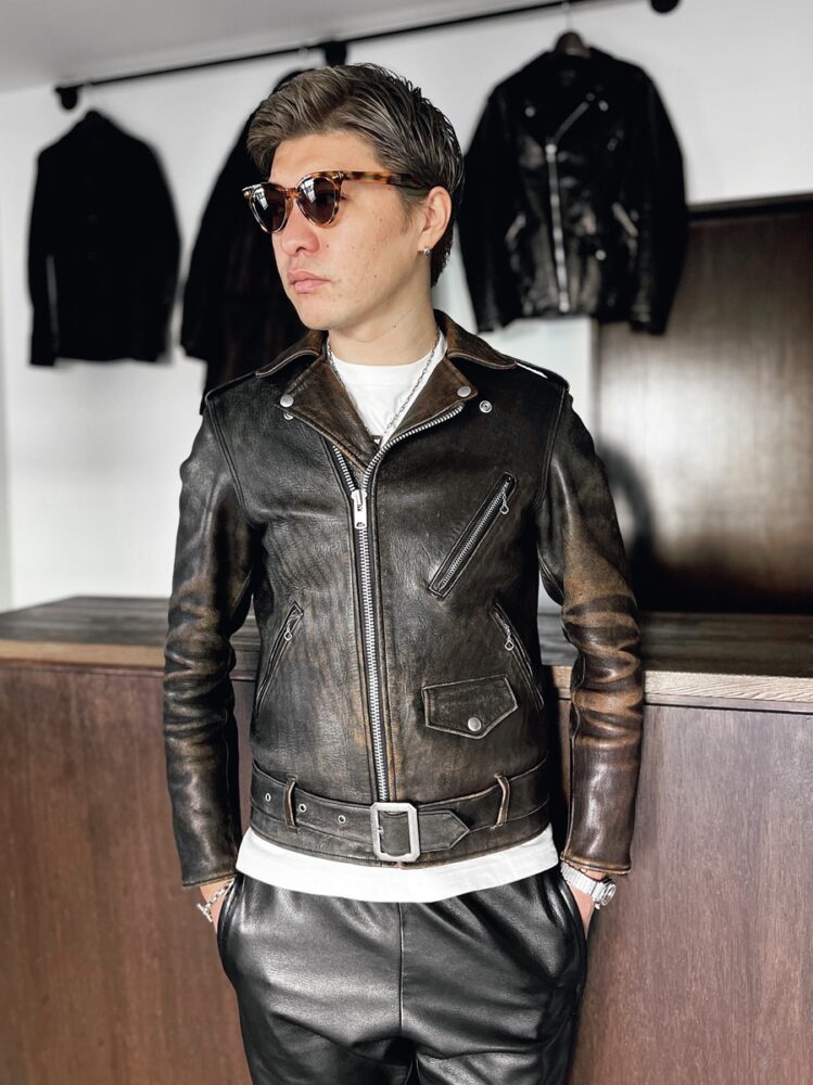 1950年代から1970年代のダブルライダースの意匠を組み合わせ、ファインクリーク代表の山﨑さんの理想のジャケットに仕上げたのがこちらのレオン。1.8㎜厚のベジタブルタンニン鞣しの馬革を用い、まず芯通しで茶の水性染料で染め、その後に芯まで染めないよう、黒の水性染料で丸染めしている。このような手の込んだ革のため、着込んだ後のエイジングは、まさにヴィンテージそのもの。この写真を見てほしい。こちらは久永さんが着込んだもの。古着さながらの“面落ち“した茶芯が出現している。レザーラバー垂涎のモデルなのだ。206,800円