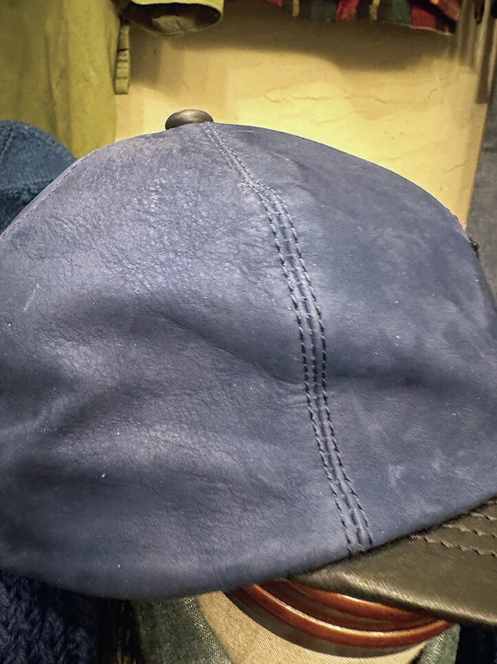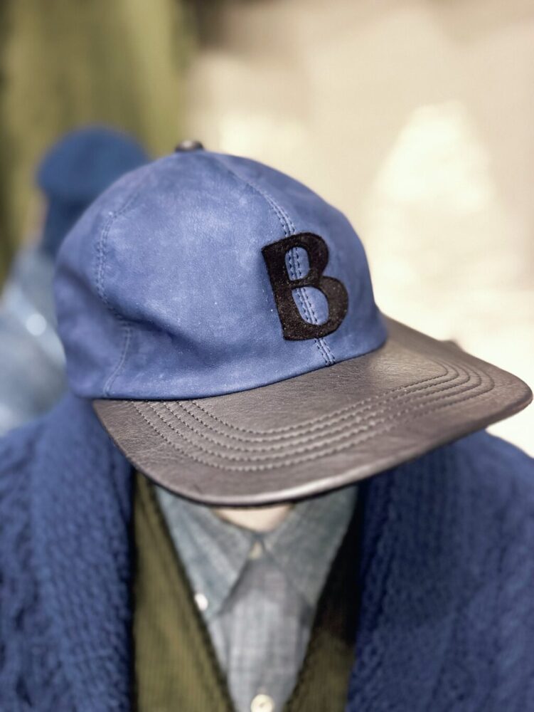 不思議なもんで、素材を革に変えただけで、とってもレトロな佇まいでしょ。2色に色分けされているのも嬉しい。ツバとテッペンのトップボタンだけスムースレザーで、帽体はヌバックを使用。内張がないから、夏に被ったら変な汗染みが出そうなので、冬の間に被りまくっている。ネイビーの服が多い私にはぴったりのカラー。昭和の日本男児は野球帽で育ったから、何歳になっても好きなんだよね。
