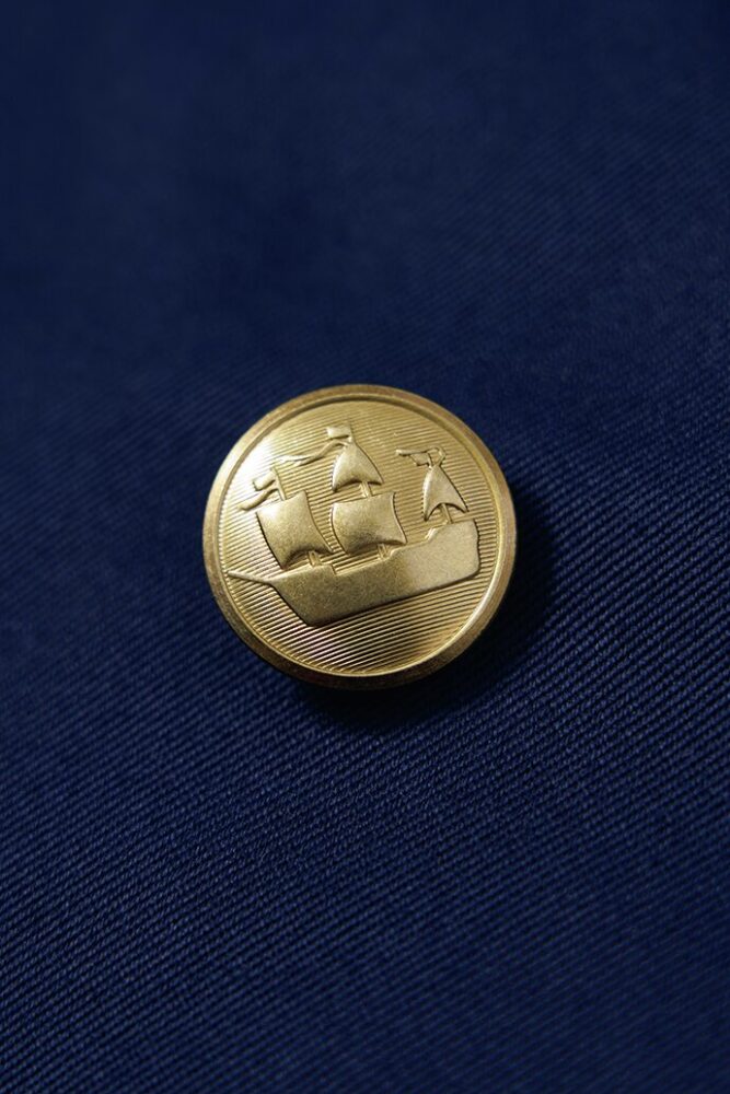 オリジナルのメタルボタンは指が触れるたびに飴色へとエイジング。ジャケットの色落ちやシワ感に馴染んでいく。