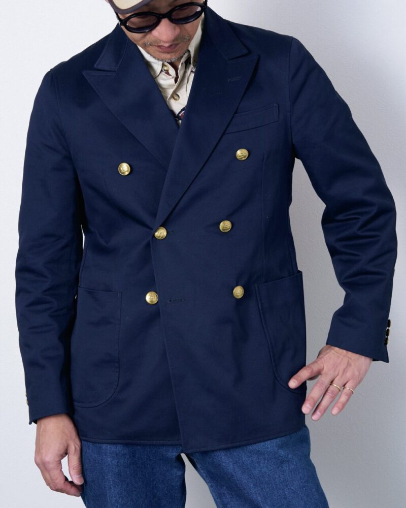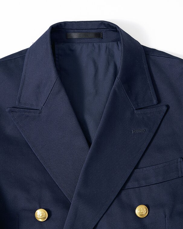 そもそもシングルとダブルではルーツが異なるという説があり、シングルの紺ブレがスポーツ観戦用、ダブルはミリタリー由来と言われている。さらに先月がウールなのに対し、今月はコットン。チノパンの説明時に聞くことも多い「ウエポン」という素材で、高密度に織りあげられたコットンツイルを使用している。洗濯を繰り返すとエイジングまで楽しめるため、ネイビーのコットンツイルが少しずつ白っちゃけてくる数年後が楽しみだ。