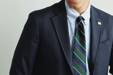 そもそもシングルとダブルではルーツが異なるという説があり、シングルの紺ブレがスポーツ観戦用、ダブルはミリタリー由来と言われている。さらに先月がウールなのに対し、今月はコットン。チノパンの説明時に聞くことも多い「ウエポン」という素材で、高密度に織りあげられたコットンツイルを使用している。洗濯を繰り返すとエイジングまで楽しめるため、ネイビーのコットンツイルが少しずつ白っちゃけてくる数年後が楽しみだ。