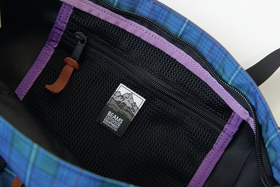 メインコンパートメントには内ポケットを備え、外からは見えないパープルカラーのパイピングも、さりげないこだわりが感じられる仕様。