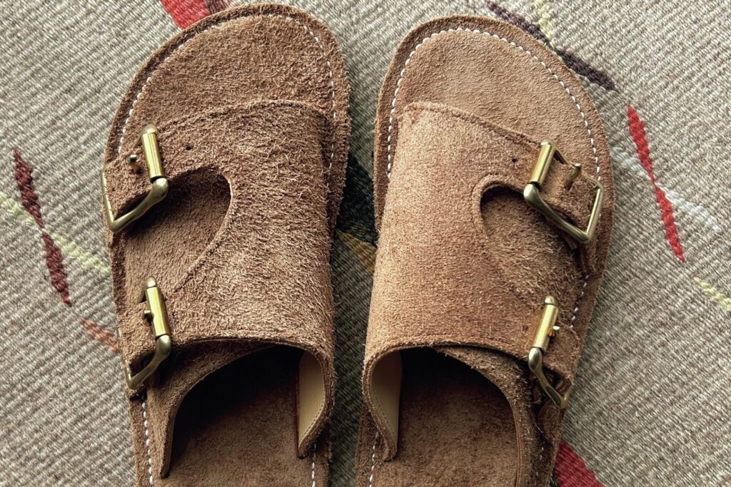 このサンダルは、ポップアップで訪れた熊本のセレクトショップ「レット・イット・ビー・クロージング」の下村さんからいただいたもの。ホースマンジョーとのコラボアイテムで、ラフアウトレザーのざっくりとしたワイルドな風合い。夏用だそうだが、厚手の靴下と組み合わせれば通年を通して履ける。しかも靴下を履くとラフアウト仕様のインソールとの摩擦で滑りにくいというメリットも。なんだかんだで、冬だけれど「ちょっとこそまで」から徐々に履き慣らしている最中だ。