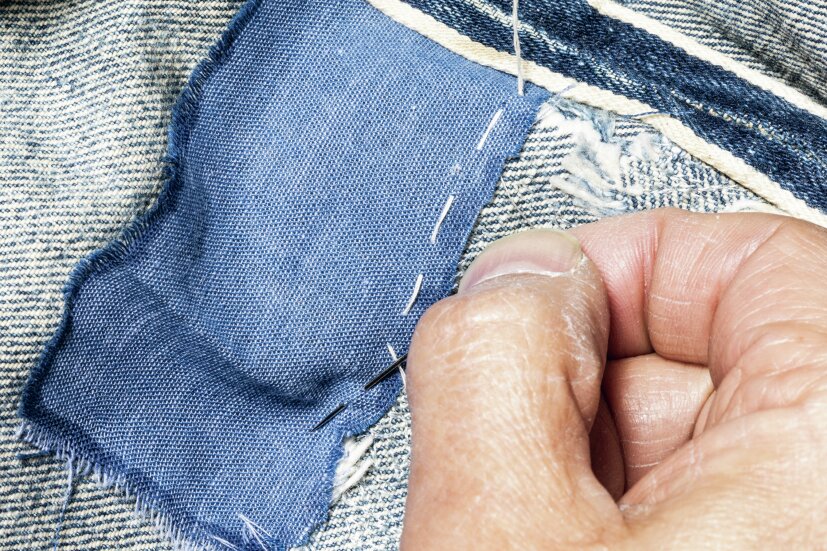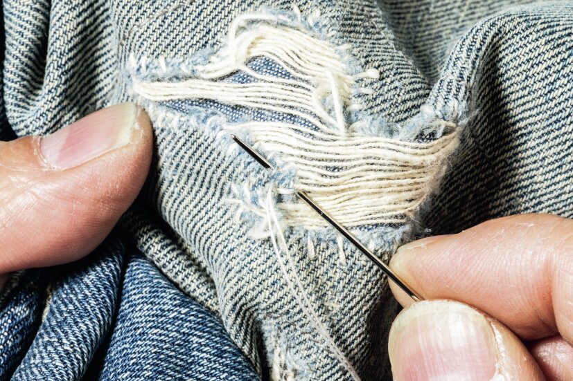 裏地の糸を1、2本すくい、3㎜先の表地の糸に針を入れる。これを繰り返すことで当て布による補修が完成する。