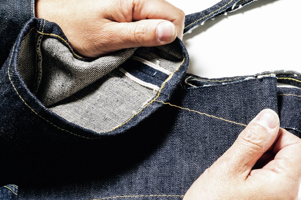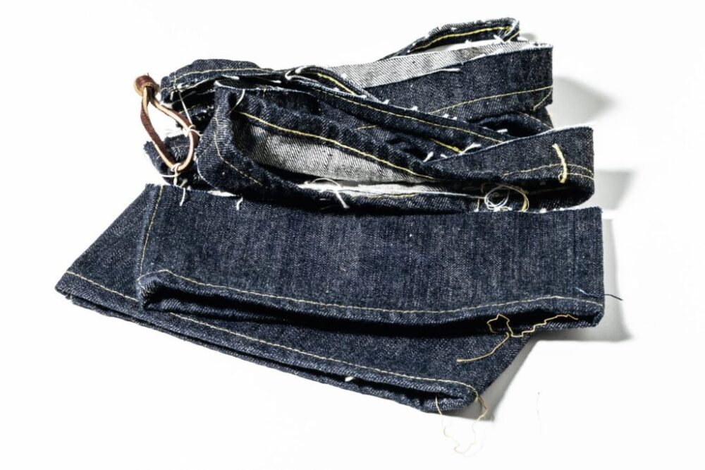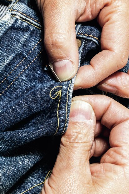 裾上げ時に端材として余る生地。いつ必要になるか不明のため保管が雑になりがちだ。しかし裾上げ時の生地から縫製糸を再利用することで、ポケット口など擦れる箇所のリペアの際に正規の糸で補修が可能となり、オリジナル性を損なわずに済む。永く穿き続けるデニムのためにも裾上げ時の生地は保管しておきたい。